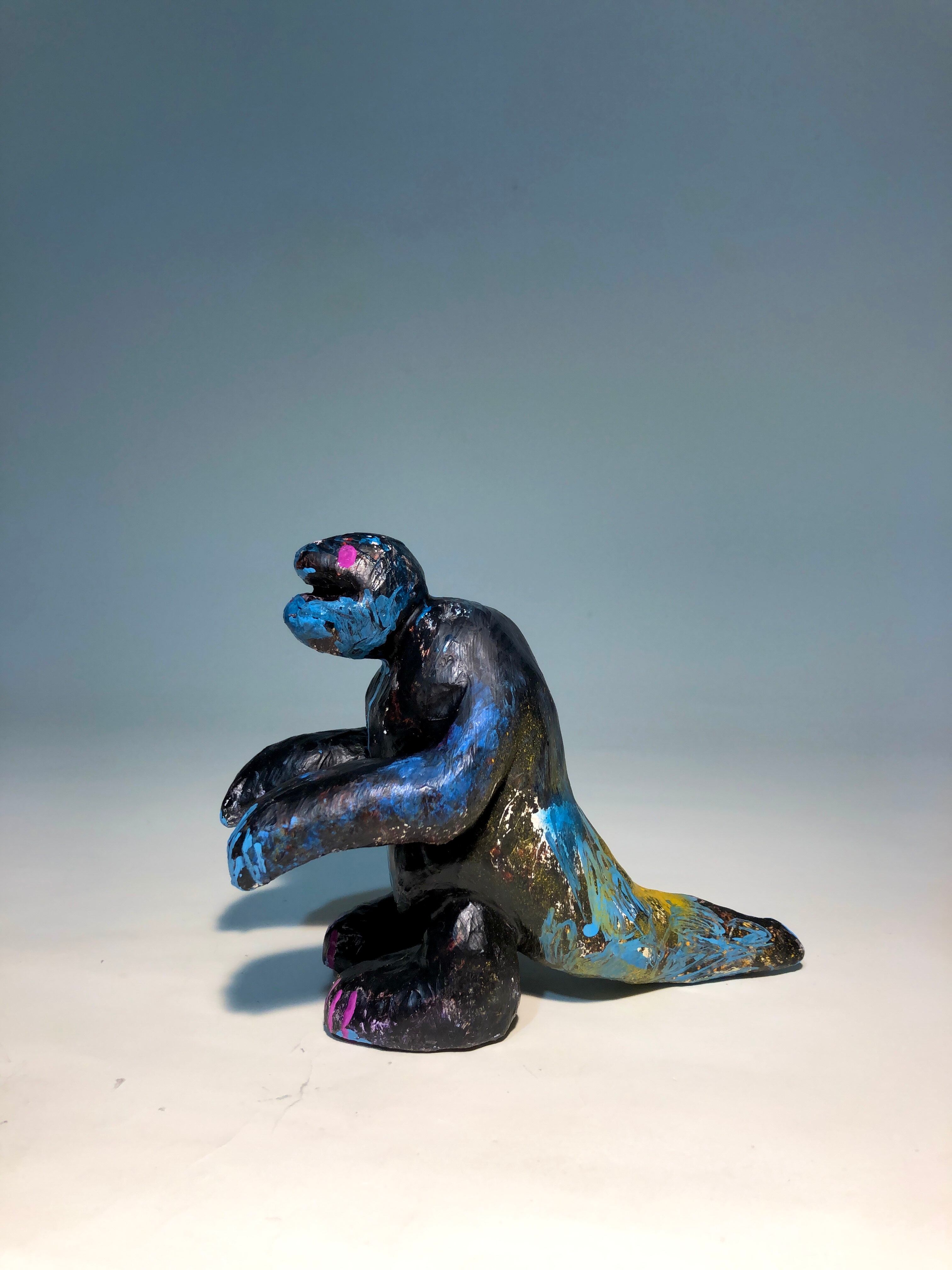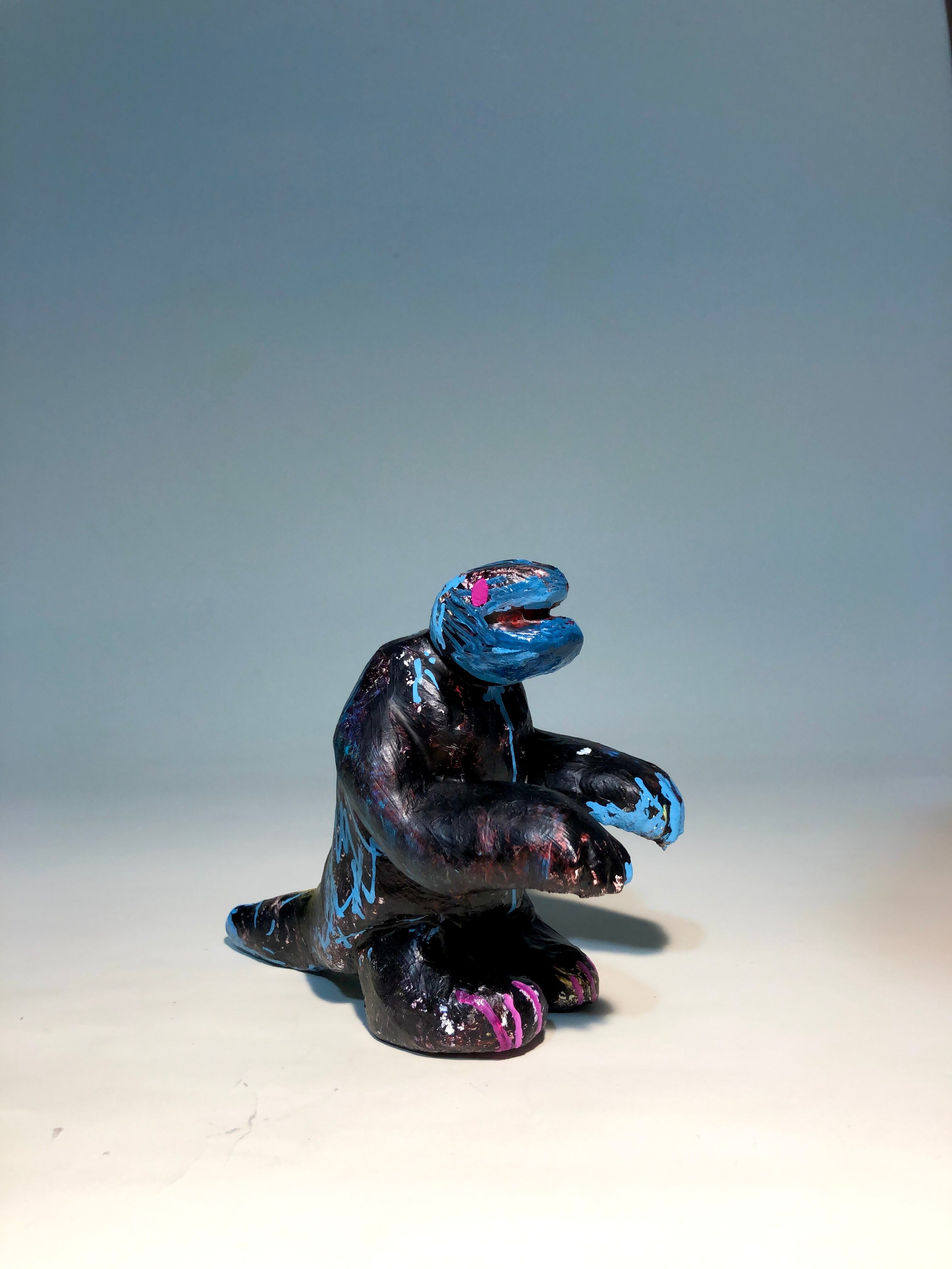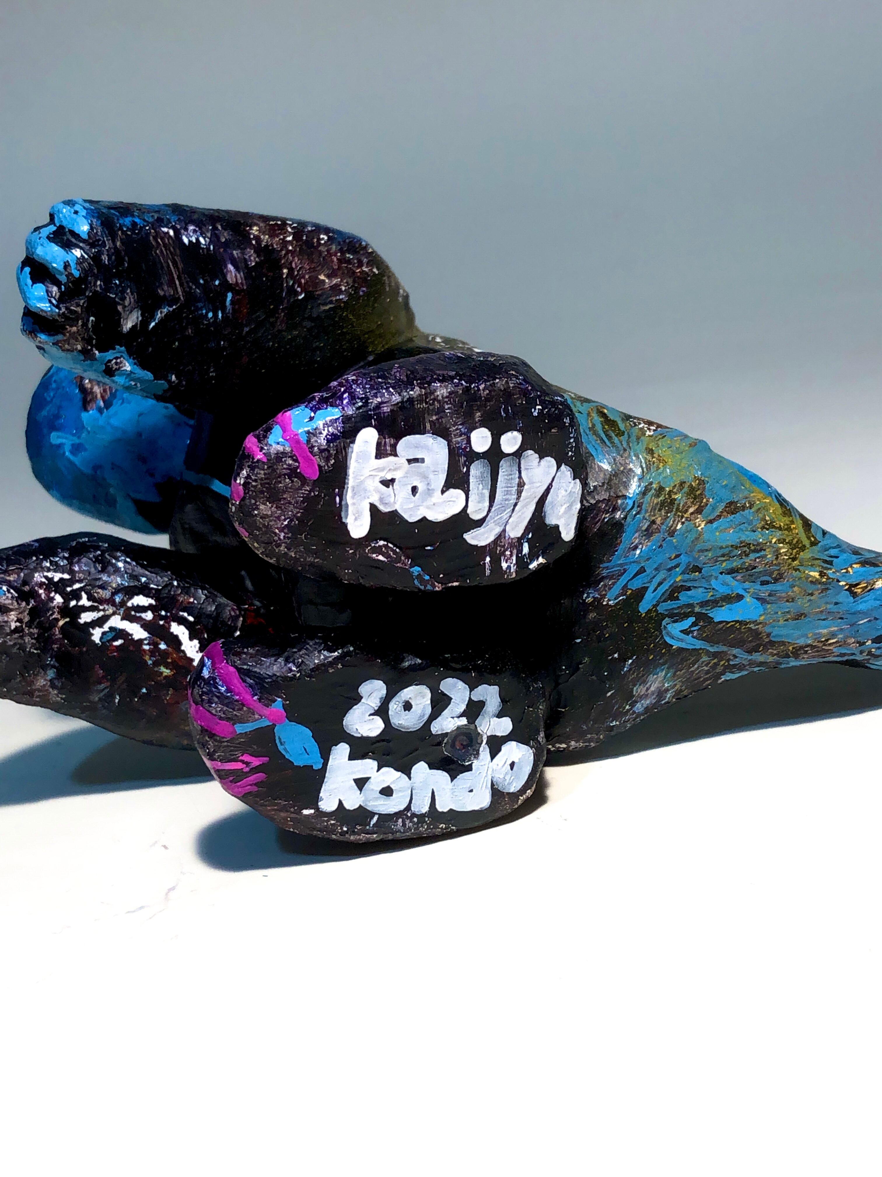 制作途中、何度もゴジラやヘドラになりかけてその度に塗りつぶしてリセットした。出来上がった形がこうなのだから仕方がない、にしても避けたい。なので考えるのをやめてスプレーを吹き散らかした。バケツの水に浸して色を落とした。水気を拭き取りながらドライヤーで乾燥させてヤスリで削った。最後は油性のインクを垂らしたり直接描いたりしていたら完走した。