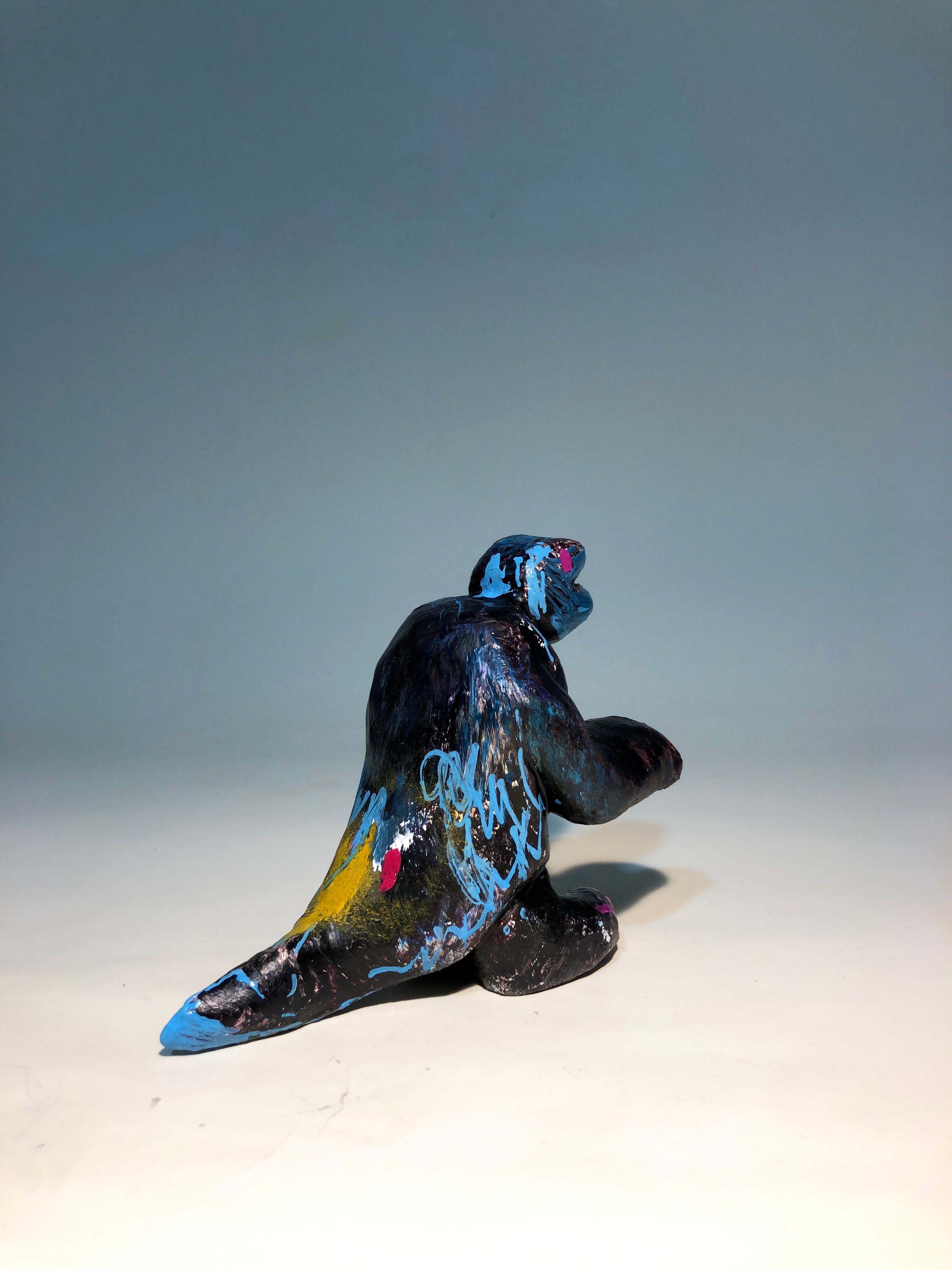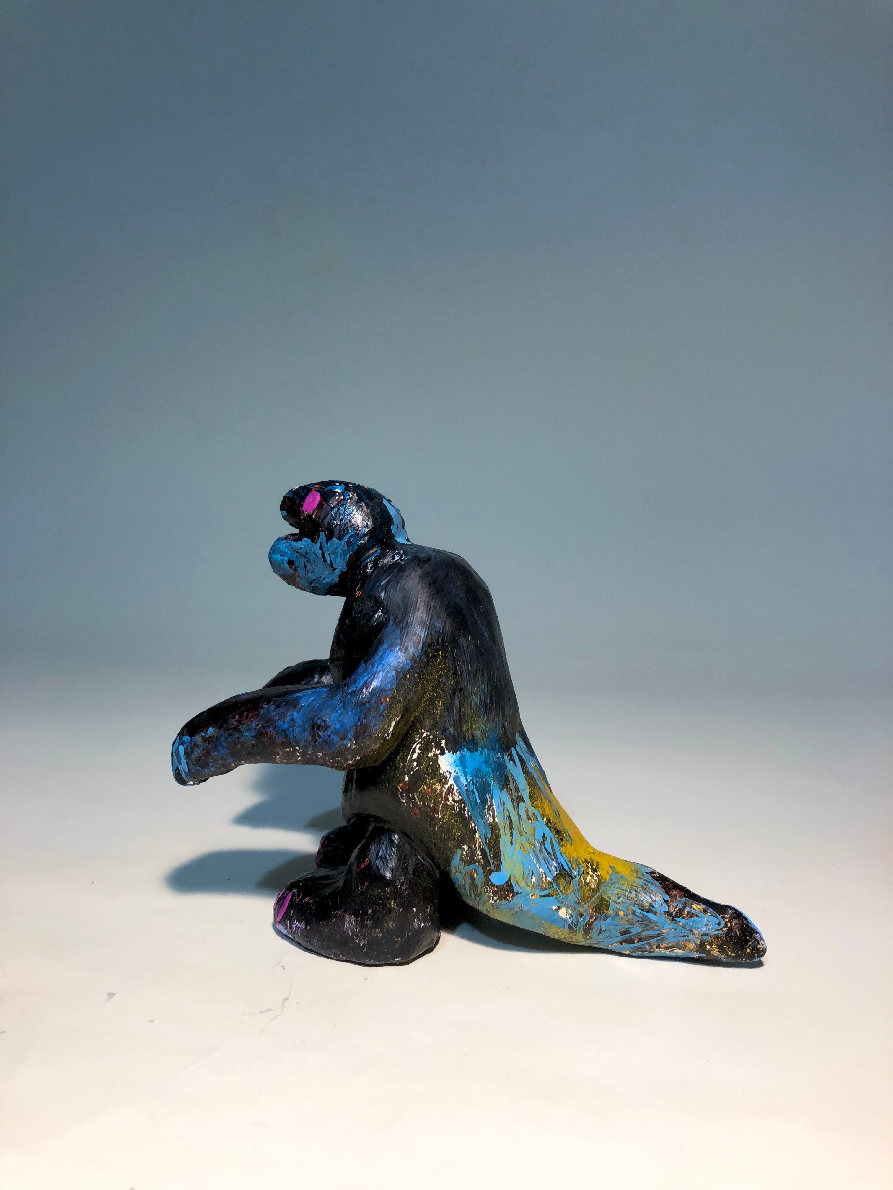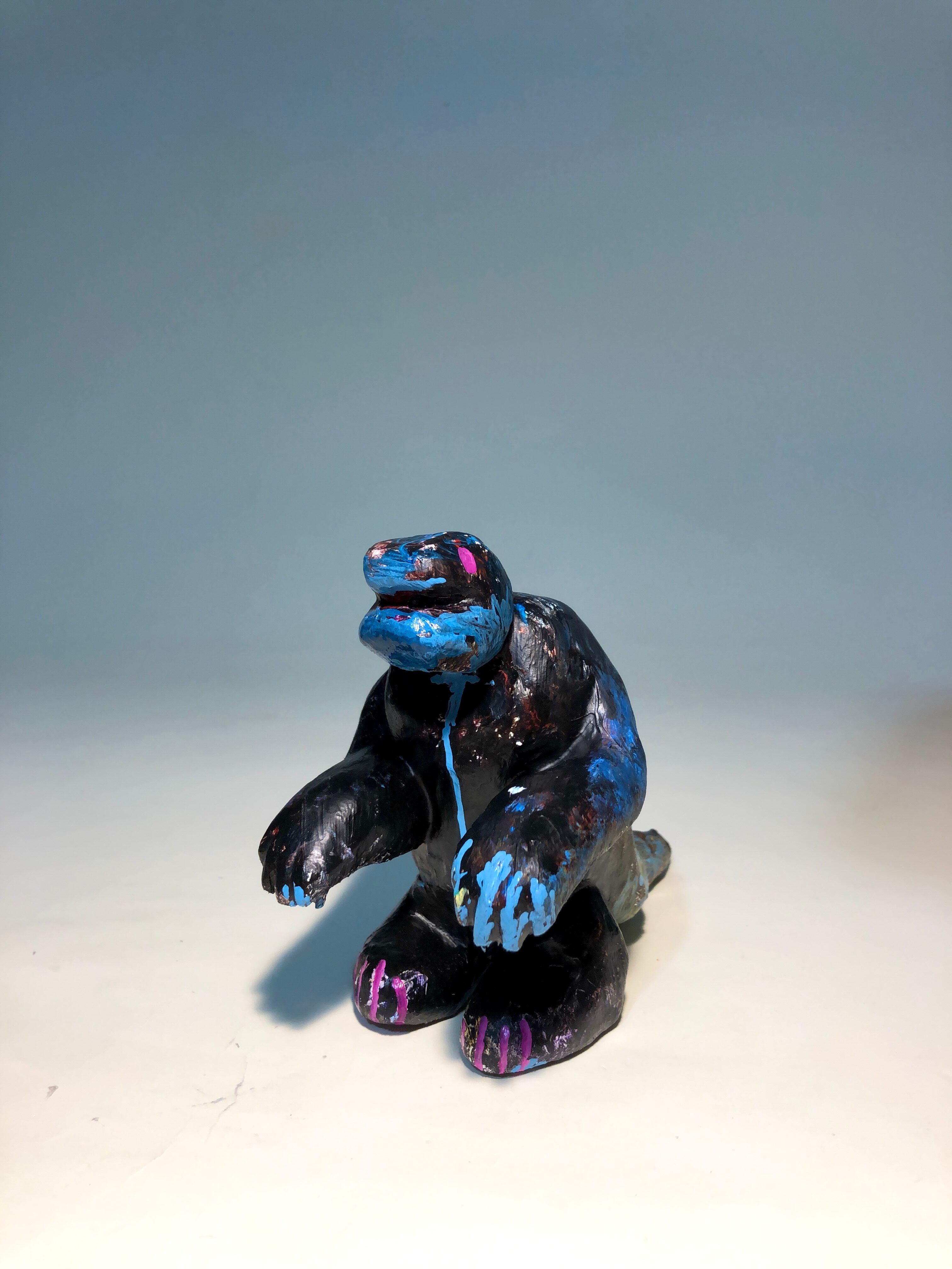 制作途中、何度もゴジラやヘドラになりかけてその度に塗りつぶしてリセットした。出来上がった形がこうなのだから仕方がない、にしても避けたい。なので考えるのをやめてスプレーを吹き散らかした。バケツの水に浸して色を落とした。水気を拭き取りながらドライヤーで乾燥させてヤスリで削った。最後は油性のインクを垂らしたり直接描いたりしていたら完走した。