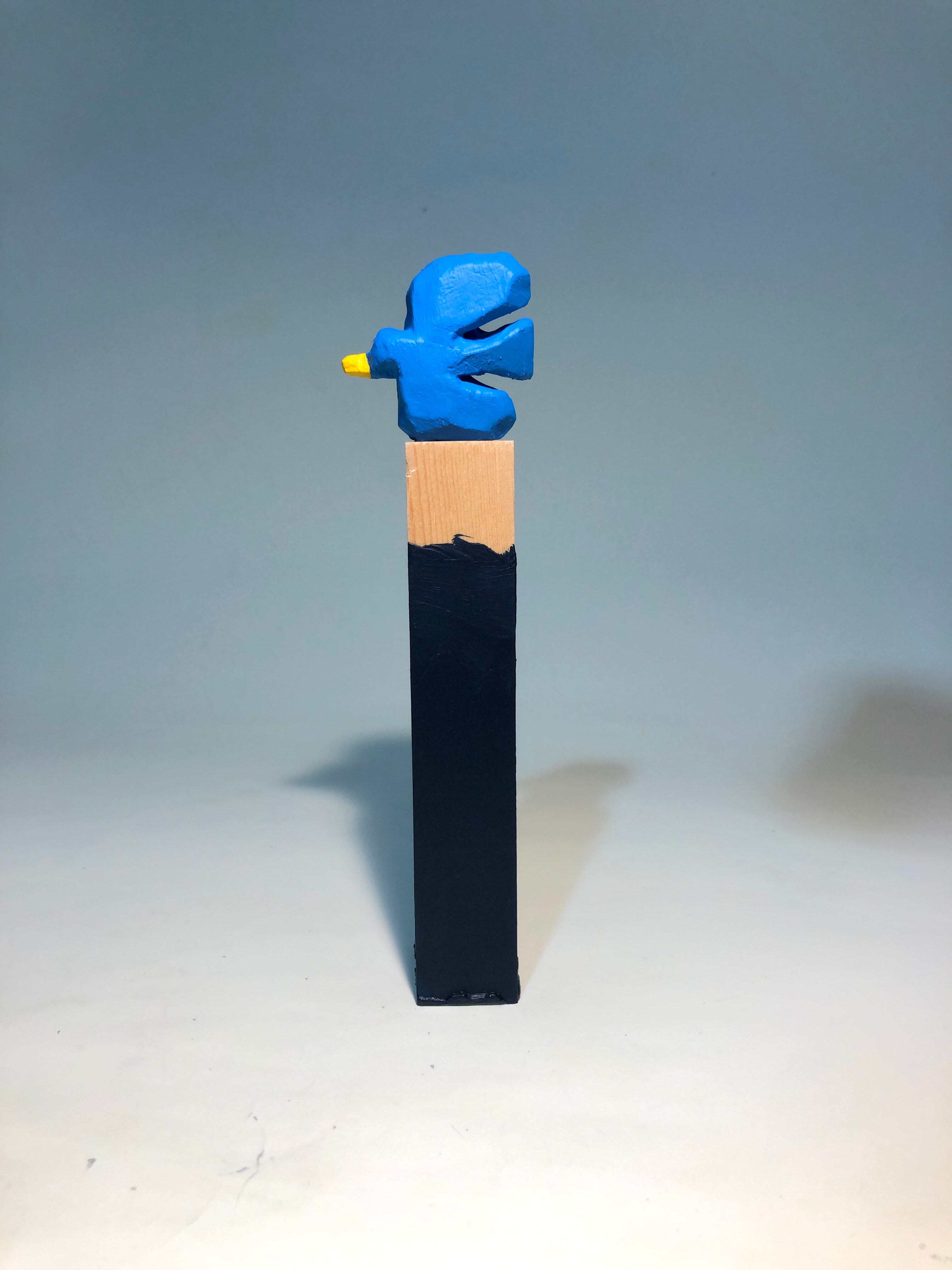 台座は紺色。動きが出るように、素の木の部分を少し残して鳥の存在感が目立つように塗っています。